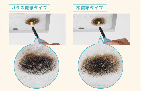 「ガラス繊維タイプ」「不織布タイプ」共に引火しにくい難燃剤を加工しているから、万一フィルターに炎が当たっても引火しにくい設計です。